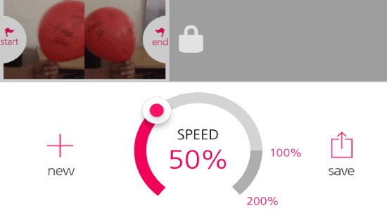VideoMotion is another free iPhone slow motion app which can be used to make slow motion videos with ease. You can either use existing videos from camera roll or record new videos using this app in order to convert them into slow motion videos. After selecting the video, you will see a green and red flag at the bottom of the screen. You can use these flags to set the start point and the end point of the video part to which you want to apply the slow motion effect. When you do that, a gear icon will appear which you can tap to open the speed slider. Then you can simply reduce the playback speed from 100% to 10 % by dragging the slider.