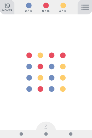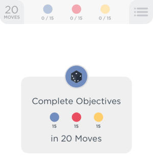 Each level you are assigned with a objective which has to be completed within a certain number of moves. You get 5 lives to play with, which keep on reducing by one in case you are not able to clear a level. At the starting of a level you are shown 2 or 3 different colored dots and the number of dots that need to be collected. For example, the below screenshot show your 3 dots Blue, Red and Yellow. You are assigned 20 moves to collect 15 dots of each color.