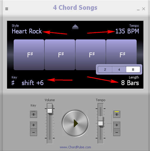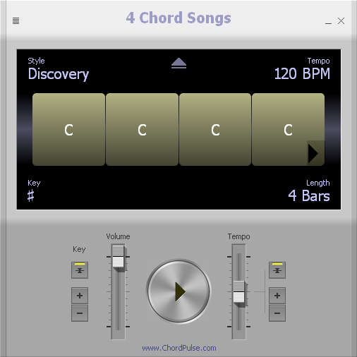 4 Chord Songs is a free musical application that offers over 50 different 4 chord melodies which you can use when creating songs, witting lyrics or doing anything else that requires a little bit of inspiration and a little something to play in the background to give you tempo and rhythm. Changing the melody styles is very easy, and you can also change various other aspects like tempo, key and length.
