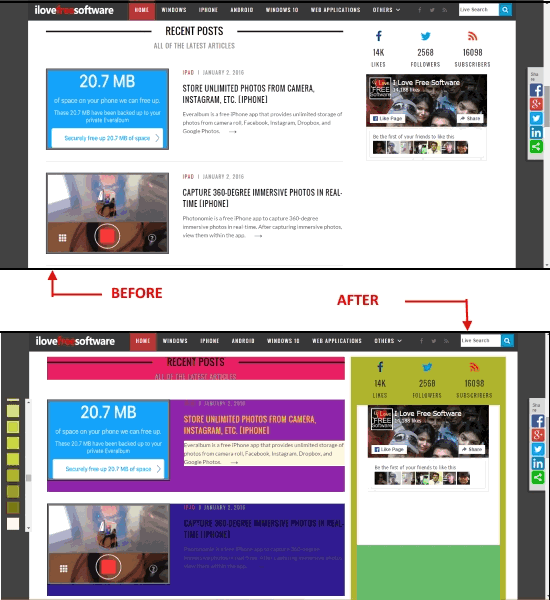 In the screenshot above, you can see the mess that I have created on our own website using this extension. On the top half is the original webpage, while bottom half has the colored webpage, that shows my artistic skills. What you can clearly see is that I was able to separately color different elements of a webpage, including text.