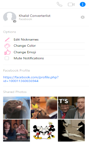You can give nicknames to your friends using Edit Nicknames option. Chat colors can be changed using Change Color option. You can set any emoji for a particular chat using Change Emoji. If you don’t want to get disturbed by notifications of a certain conversation, then you can stop notification for it by using Mute Notification. Link to the Facebook profile of the person you are having a conversation with is also displayed on the right side of the interface. All the files shared between you and your friends are also displayed on the interface under Shared photos.