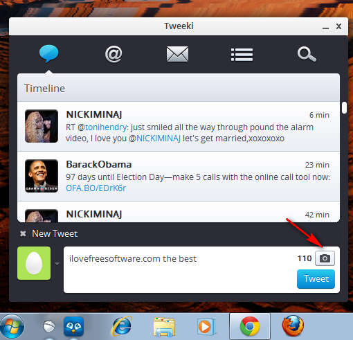 On the image above we can see how easy it is to post tweets with the help of Tweeki. First step would obviously be to open up the Tweeki application, by clicking on the icon in the taskbar. Timeline tab, the first one from the left should be open by default, and at the bottom you’ll see the New Tweet box. Important thing to notice would be the small image icon above the tweet button, which you can use to upload images.