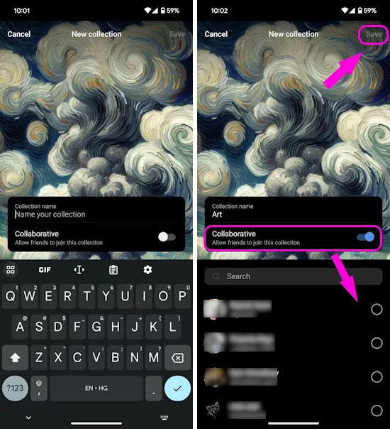 When you choose to make a new collection, it asks you to give a name to it. Alongside that, you get a toggle to make the collection collaborative. When you enable the collaborative toggle, it lists your friends with a search bar at the top. From there, you can select with whom you want to share the collection.