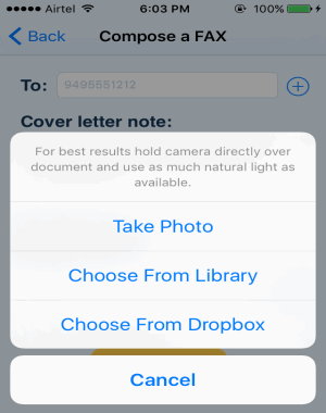 Step 3: After adding recipient’s fax numbers, you will be able to add files to the fax. It only allows you to send photos as a fax. It lets you add photos from your camera roll or you can use the camera option to take photos of your documents. It even has the option to import photos from Dropbox, OneDrive, Google Drive, and Box.