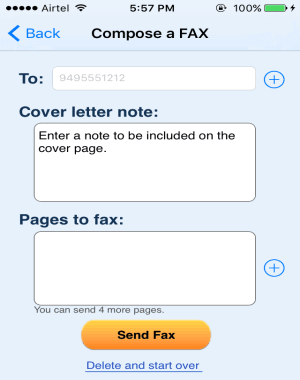 Fax Burner is another free app which can be used to send free faxes from iPhone and also receive faxes. But, the free version of this app is limited for sending only 5 outbound fax pages per month for each account. This app also allows you to send faxes to anywhere in the world. To send a fax, all you need to do is enter the recipient’s number, cover letter note, and add photos as fax pages.