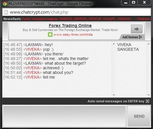 If in case, you choose another password then you wont be able to read the chat message, as a huge number of random characters will appear in front of you, which will make the message even more complicated. To use this chat encryption tool in its best way, you’ll have to create a complex password so that nobody can crack it. Checkout the above screenshot, to view the difference between partners sharing same passwords and incorrect password.