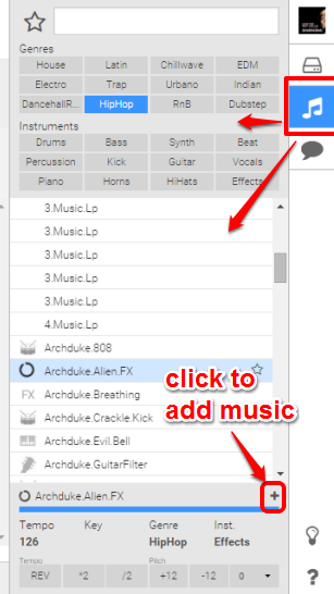 • Music: It lets you explore all the available royalty free sounds, filter them by selecting the genres, and preview any sound just by clicking on that sound. After this, you can add that sound using ‘+’ button.