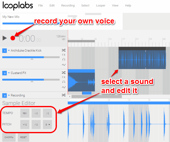 All your added sounds are visible in the editing area. Here you can select any sound to edit it (change tempo and pitch), drag it to any other place, adjust the volume, etc. You can also record your own voice and add it with other added sounds.