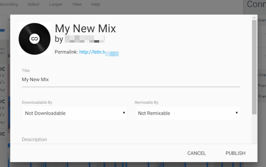 When you are done with editing, you can save the recording, and finally use File menu to publish it. Before publishing the music, it lets you set whether you want to let others download and remix your music or not and add music description.
