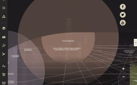 You might feel confused the first time you look at Musicmap with all the lines, colors, grids and circles. In fact, it’s simple but just a little condensed. At the top are musical styles in circles that were identified in the 1800’s. They spawn out different genres that later develop into various other genres as time passes. On the left side of the interface is a panel where you can check out the introduction and abstract of Musicmap. The legend of the map is available for toggling too. Users can navigate to a specific genre and also search for a genre with Navigate and Search functions respectively.