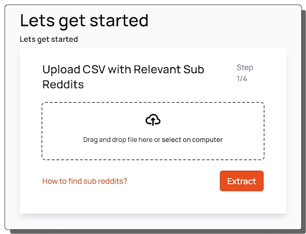 To get started with Reddit Insights, you must create a list of relevant subreddits to your research. Put all the subreddits into a CSV file and upload that file to this tool to extract the keyword insights.