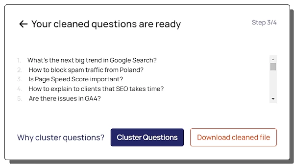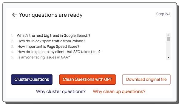 And if you do have a key, you can add that in this step and clean up the questions using GPT. The AI removes the duplicate questions and similar questions streamlining the list. Again, you can download the cleared list of questions as a CSV file at this step.