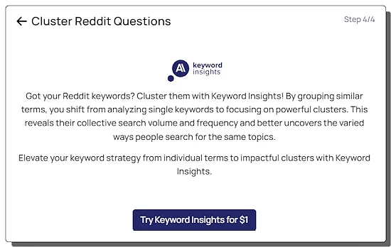 Keywords Clustering is another step to further organize the questions. It uses Keyword Insights to cluster the keywords and get their collection search volume. However, this is a paid step. It charges $1 to cluster the list. This is not a necessary step. You can skip over it and download the file anyway.