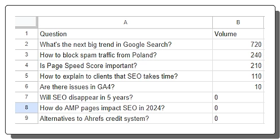 The downloaded CSV file has two columns: Question and Volume. It lists all the scaped questions that you can clean up or cluster if you like. Alongside the questions, it shows the search volume.