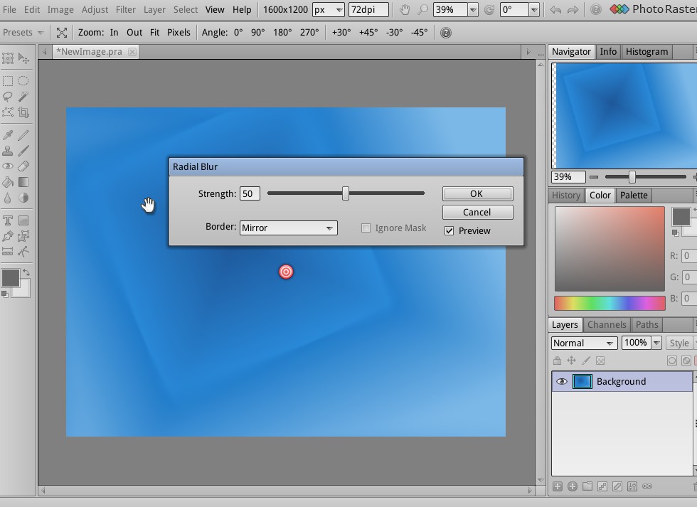 Second thing that we used was the radial gradient tool, on a new image and then we opened up filters and once again we used a radial blur filter. When you’re all done with image editing, click File >> Save and export your creation.