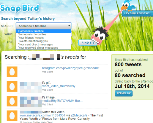 Snap Bird is also a good website to find old tweets and comes with multiple options. You will be able to find your friends’ tweets, received and sent messages, tweets mentioning you, and someone’s favorite tweets. So, couple of good features available in this website, and you can use any option according to your requirement. You must sign in to your Twitter account to use this website.