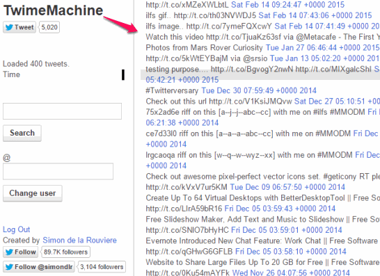 TwimeMachine will provide you the list of all tweets on its very simple interface. You can quickly scroll down to see all the old tweets because only the text content and hyperlinks of tweets are visible. Date and time for every single tweet will also be visible to you. You can click on any hyperlink to open that particular tweet on your Twitter account.