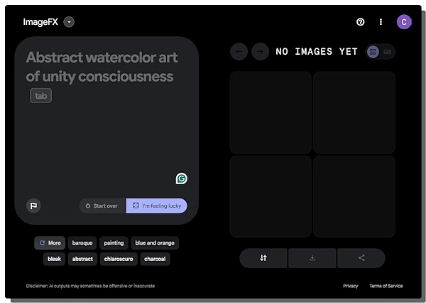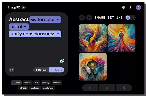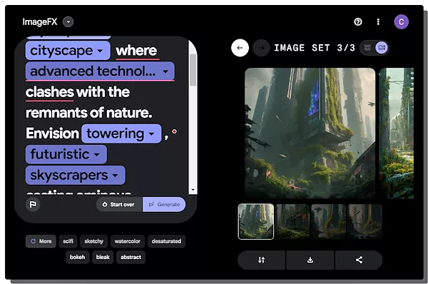 To create images with ImageFX, you have to type your prompt and click the “Generate” button. It takes a few seconds to generate the images and then shows the generated images in a set of 3 or 4. This prompt interface uses “expressive chips” that automatically pick some parts of your prompt and let you quickly experiment with different concepts and styles.