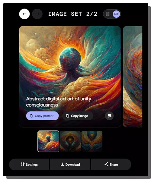 This tool features two layouts to show the generated images. One is a grid view where you see all the generated images in a grid with smaller previews. And the second one is this list view where you can cycle through the images. Hovering the cursor over an image shows the prompt with quick options to copy prompt and copy image. The tool has a Settings button that lets you lock or unlock seeds to experiment with varieties.