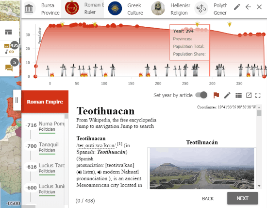 You can randomly read any articles. Here, the map shows you an article where you can find religion, province, ruler, culture, etc. You can view pictures and see population by years. Also, you can know which war was fought for what purpose.