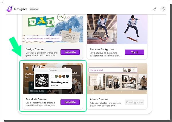 The AI integration in the Microsoft Designer allows you to quickly generate Brand Kits. Right after you log into the Microsoft Designer with your account, it lists a set of things that you can create using generative AI. Along with the Brand Kit, it also includes images, stickers, designs, and more.
