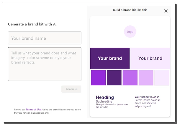 Brand kit generation is a feature in Microsoft Designer. It allows you to create complete brand kits, including logos, color palettes, fonts, etc. Starting with the brand name and short description, you can create a brand kit. Then you can further customize it by adding your brand logo and brand voice, color schemes, and font. You can apply the brand kit to any design created in Designer. You can also download the brand kit that includes the logo, brand card, and JSON with color and font info.