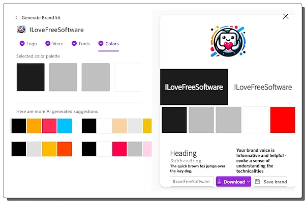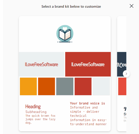 When you select a template, it opens that template over full screen. It keeps the brand kit preview on the right and opens customization options on the left. You can add logo, voice, fonts, and color schemes. Based on the logo, it does provide AI-generated suggestions for the color scheme. However, if you don’t like any suggestions, you can configure a color scheme manually and finalize your brand kit.