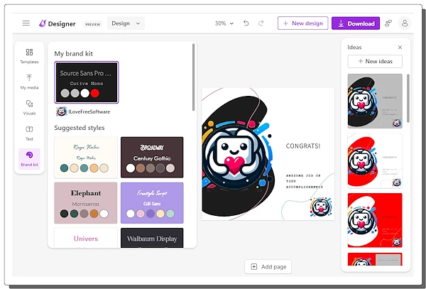 This post explains how to create Brand Kit in Microsoft Designer for free. Microsoft Designer is a web-based graphics designing tool. This tool is powered by AI that allows users to generate graphics, logos, illustrations, and other visual content. It provides templates and AI-generate design elements tailored to various use cases. Those templates offer features like image placeholders, icons, charts, graphs, shape tools, and text tools to create custom designs easily. You can use Designer to create social media posts, presentations, infographics, and more.