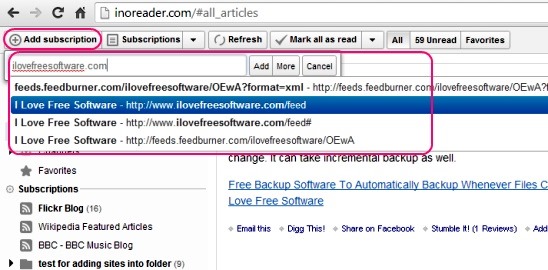 InoReader has all sets of tools and features, required for a good RSS feed reader. The tool bar at the top on interface is very handy. You can add feeds manually by clicking on Add subscription button and then enter the website URL. The website shows real-time suggestions while searching for source website.