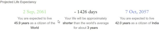 Then the last statistic you see is your projected life expectancy in terms of citizen of the world, as a citizen of your country, etc. All the data used here is produced by United Nations and the website uses it for medium population projection up to year 2100. The website also uses life expectancy tables from UN to generate projected life expectancy dates.