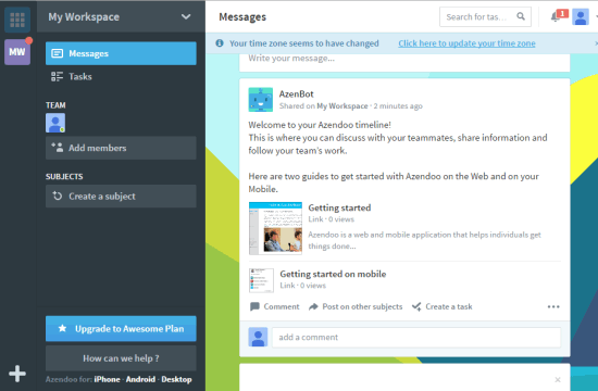 Azendoo (free subscription plan) is an online task management website that provides 10 GB shared storage space. So you and your team members can add tasks, attach files, assigns tasks to each other, create to-do lists, and send messages without worrying about the storage space. With this free plan, you can invite unlimited members to join your workspace and collaborate together.