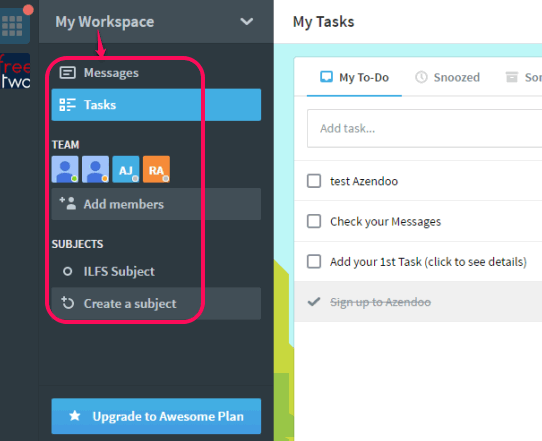 - You can access all important options (available under My Workspace) using the left sidebar. You can see all the team members, messages sent and received by you, list of all the tasks, etc.