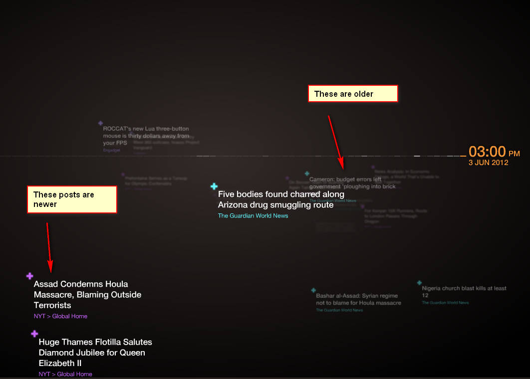 The links that you see in bold, or should I say links which are more closer to the screen, they are new posts, and the ones that you see in the background, which are more fainter these are the ones that are older. They can be accessed by scrolling with the mouse wheel, or by clicking on the link which is in the background, to make it more easy to read. Directional keys on the keyboard can also be used to reach older posts.