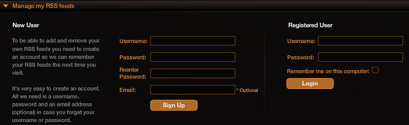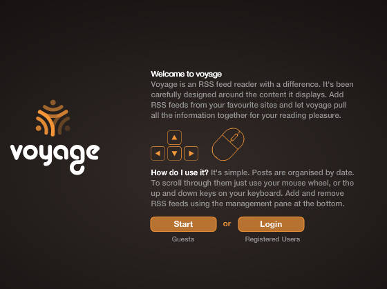 This will reveal to you options to register a new account or to login to an existing one and check new feeds, that were updated since the last time that you’ve logged in. Registering allows you to enter your own feeds, the setup is pretty simple, just add the RSS feed URLs into your account and then once that they are updated you’ll be able to scroll through to them in this very cool way that RSSVoyage offers.