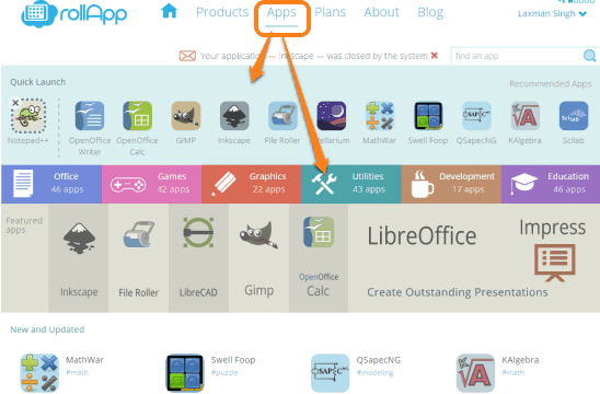 Step 1: Access this link and you will be directed to the apps section of rollApp service. There you will find all the desktop applications supported by this service. The software are divided in different categories, so it will be easy to find the desktop software that you are looking for. Available categories are: Office, Graphics, Utilities, Development, Games, and Utilities.