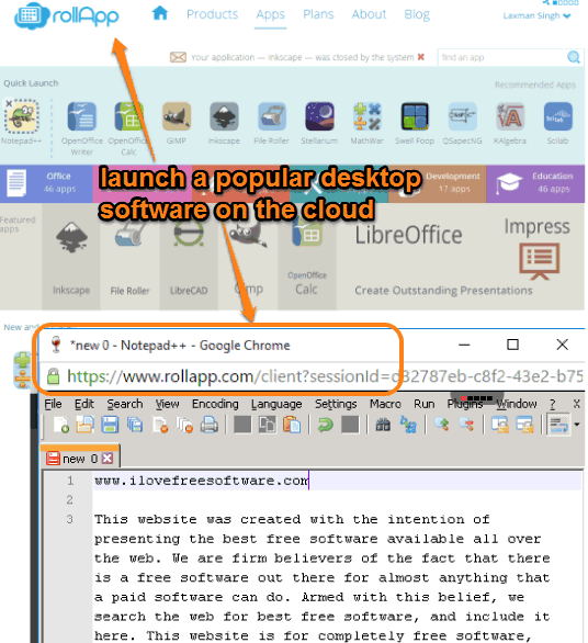 This tutorial explains how to use popular desktop software on the cloud. For example, you will be able to run Notepad++, Inkscape, Gimp, LibreCAD, Skype, LibreOffice, and many other popular desktop apps online. It is made possible with the help of a SaaS (Software as a service) platform, named rollApp.