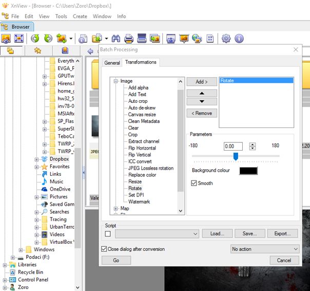 XnView is an image rotate software for Windows 10 which can do much more than just rotate photos. Over 500 file formats are supported (some of them aren’t even image formats). Images can be resized, renamed, cropped, color balance changed, watermarked and more. Rotating photos is very simple, use the built file browser to find and select the images that you need rotated. Right click and select “Batch processing”. Go to the “Transformations” tab in the window that pops up. Select “Rotate” and adjust the amount that you want images rotated (in degrees). Alternatively you can use the presets like rotate 90° or flip vertically/horizontally.