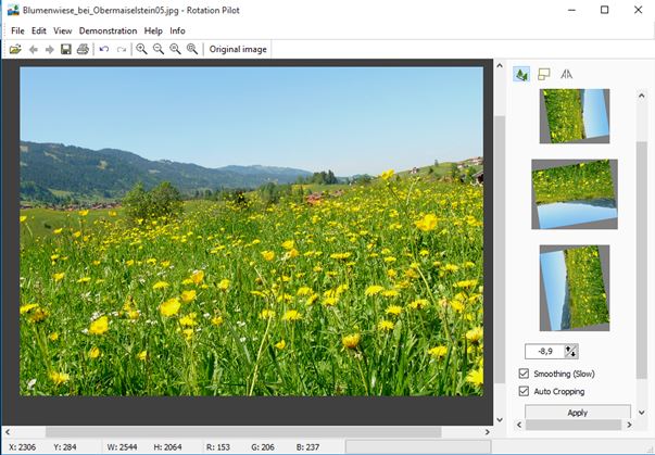 When you have an image that’s lopsided, use the line tool (at the top of right sidebar) and create a guide line. In my case I drew a guide alongside the hill up top. Software will then calculate the direction of the guide line and amount of rotation needed to make the image properly aligned. Additional useful functionalities are edge smoothing and auto cropping. They can be activated by putting check marks at the bottom of the sidebar to the right. Sidebar also has quick rotate shortcuts for the normal 90° image rotation. All the usual image formats like JPEG, PNG, BMP, etc. are supported.