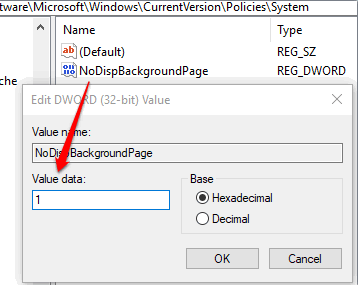 Step 4: Under the new System key, create a DWORD value, and then rename that value as “NoDispBackgroundPage“.