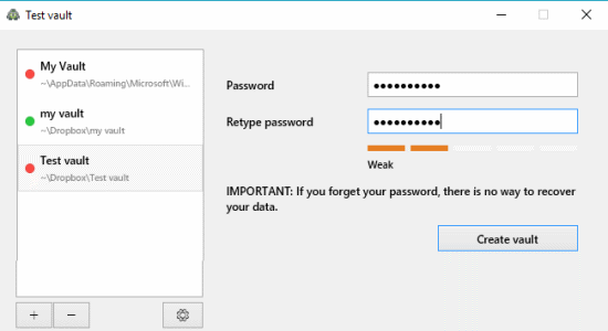Step 3: After that, it will ask you to set up a password for that particular vault. Once you’re done with entering the password, hit the “Create Vault” button to initiate and create the encrypted vault. Then click the “Lock vault” button at the bottom and close Cryptomator.