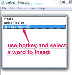 The inserted text can also be exported as *.tpt file, so that you can import it back to its interface, when required. After inserting all the text, you can close its interface, and it will start running in system tray. Now you can open any text editor and can use Ctrl+B hotkey to open a small window containing all text, inserted by you on TypeText interface. Select a required word and press enter. That text will be inserted immediately and automatically.