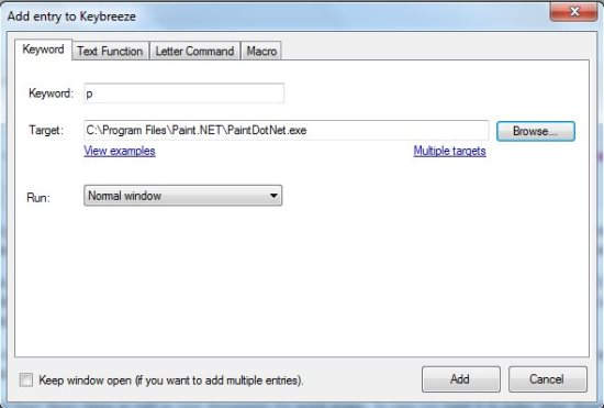Now if you don’t want to type the name of the programs or files you use frequently, then you can denote them with single letters. Bring up Keybreeze interface and type add keyword. This will open up a window like below.