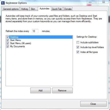 Keybreeze indexes you desktop and Start Menu items as well as your documents for quick access. In case you want it to index other directories then type “options” in the Keybreeze window. This will open up a window like the one shown below. Here in the Auto Index tab, you can add folders or directories you want this software to index for you. Apart from this, you can also make some general changes like run the program at Windows startup, change skins, change the Global hotkey, etc.