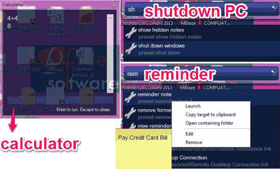 Similarly, you can set reminders which pop up as sticky notes on your desktop. You can use it to do calculations like you do in a calculator. It also lets you shutdown PC, reboot your PC, run screen saver, etc. The screenshot below shows some of these functionalities.