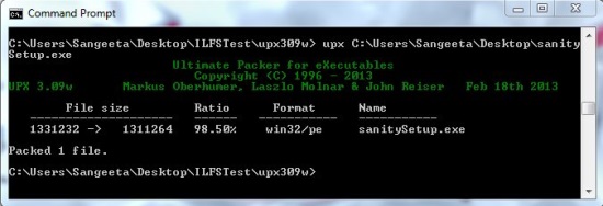 Now simply type the desired options, the output filename where you want to compress/decompress the executable(s), and the path of the executable(s) which you want to compress/decompress. After that, press Enter. This will quickly compress the file and display a report that will show you the file size before and after compression, and the overall compression ratio for your reference.