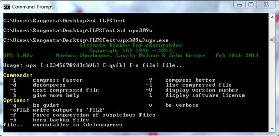 Simply launch the command prompt and navigate to the directory of folder where you have extracted the zipped archive. Now after reaching to that point, type “upx.exe”. This will display a help file in a while, with a set of commands and options.