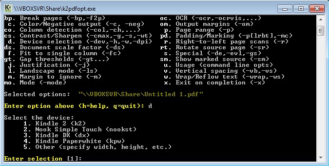 List of letters which you can see on the screenshot below are actually features of k2pdfopt. With the help of these letters you’re gonna setup a PDF optimization command which is gonna be perfect for whatever screen size the device where you would like to read PDF documents has.
