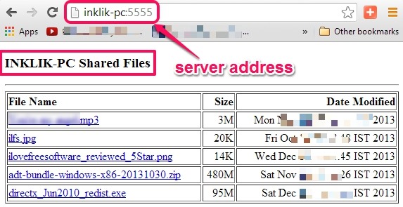 This address you can give to people (friends or colleagues) working in same network. Whenever people will access that URL on a web browser, all the file that you chose for sharing will be visible with file size and last modified date.