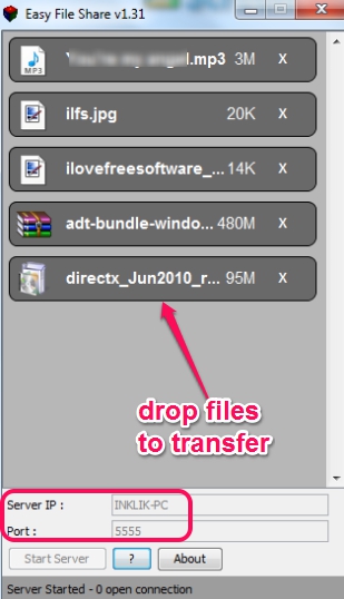 Easy File Share requires java 1.6 or higher to work. Once you will download its application file, you need to double-click the downloaded file. After this, its interface will open in front of you. Here you will find two main things: server IP address (which is actually your PC name) and port number which will come by default. Now you have to add files on its interface by dragging and dropping. These are the files that other people will be able to access from your PC.