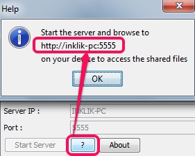 To share added files, hit the ‘?‘ button and you will get server address, like visible in screenshot below: